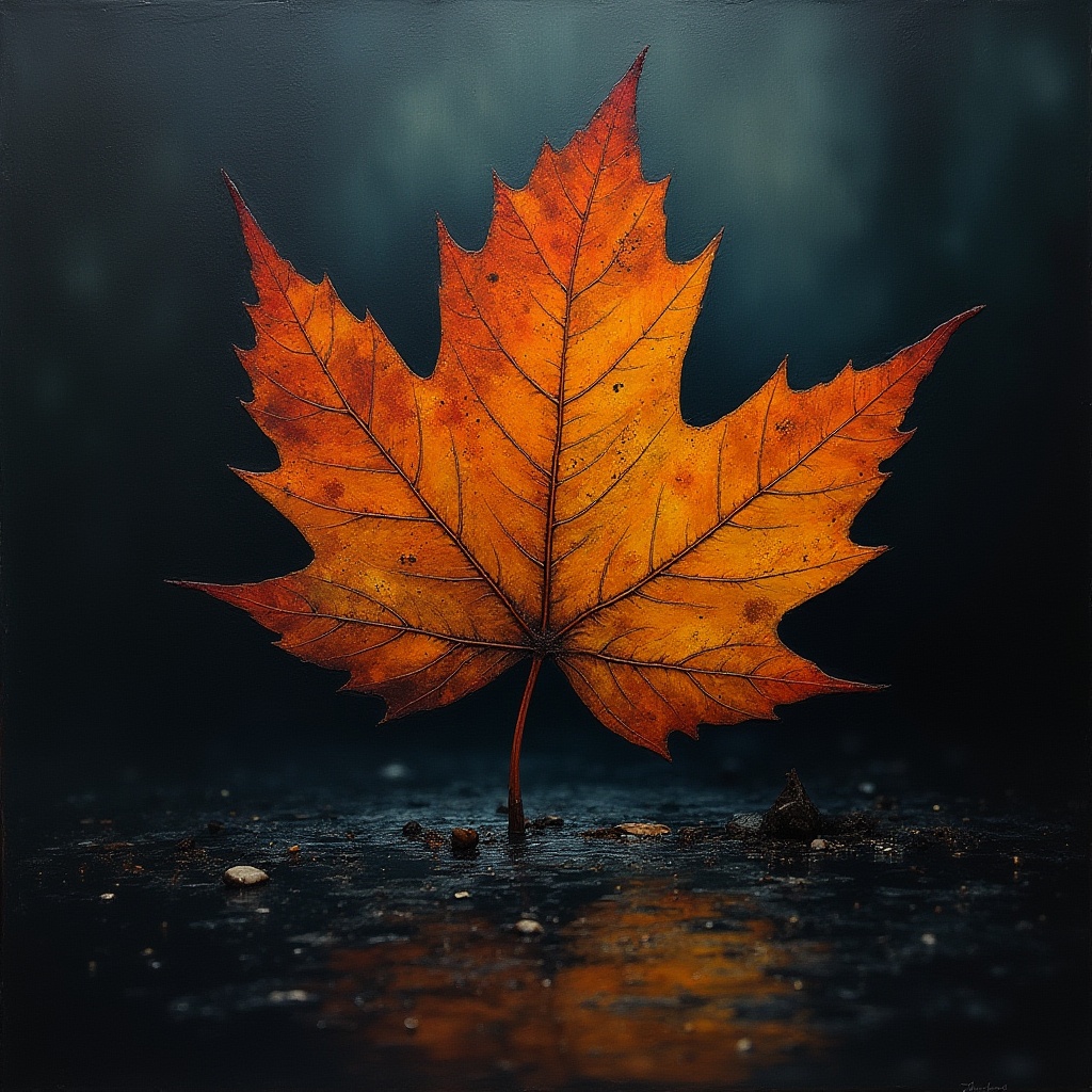 An orange maple leaf rests on wet pavement, showcasing its vibrant color against a dark background, reflecting autumn's beauty.