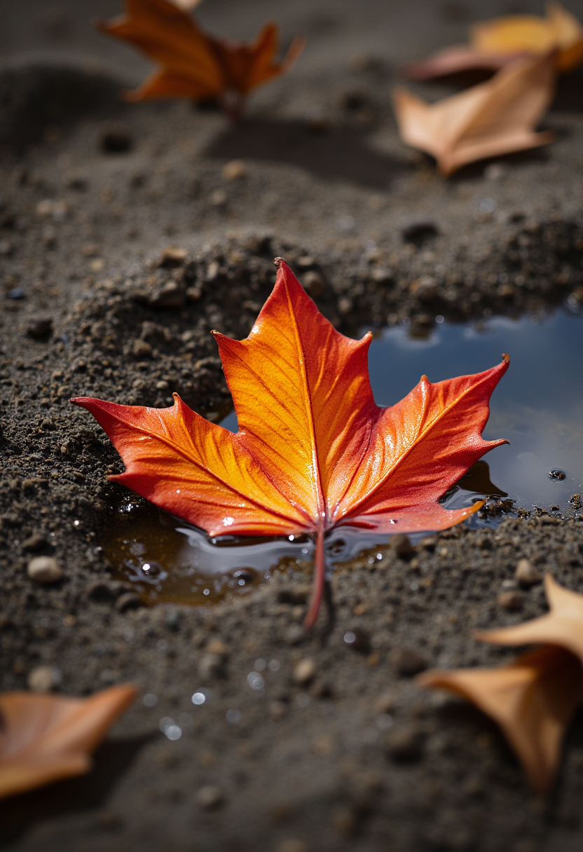 Vibrant autumn leaf resting in a puddle on the ground