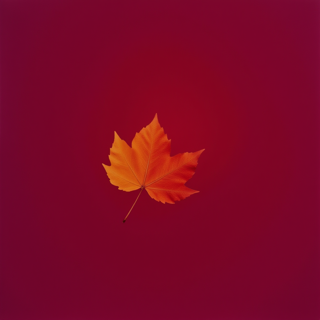 A single vibrant orange Maple leaf is centered against a crimson-colored background creating a stark, autumn-themed contrast.