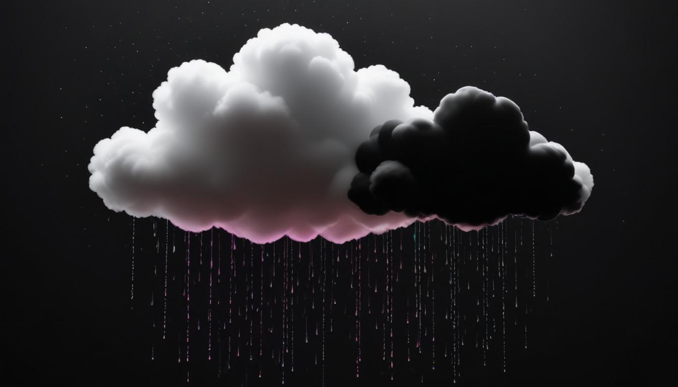 An illustration of dark and light clouds, with rain falling from them, set against a deep black background, creating a dramatic contrast.