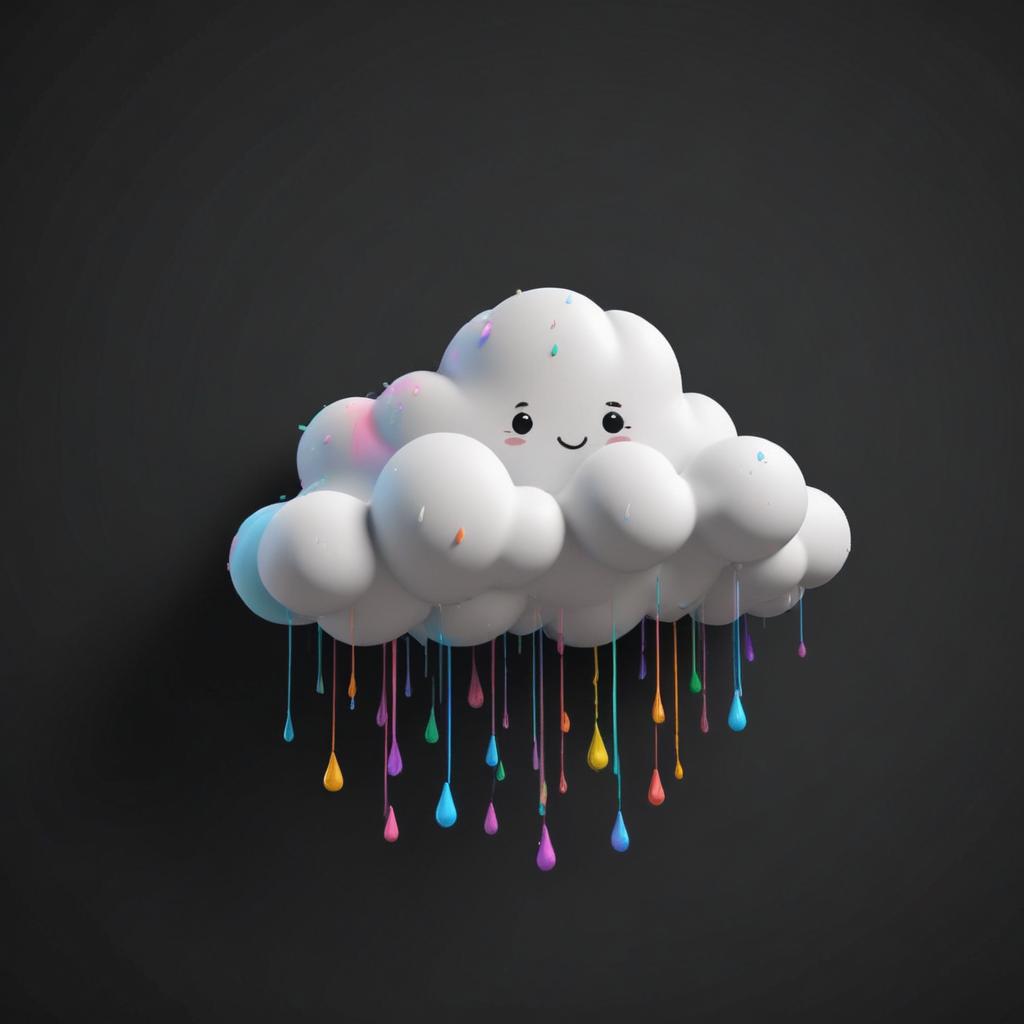 A playful cloud character with a smiling face and vibrant raindrops in various colors hanging down against a dark backdrop.