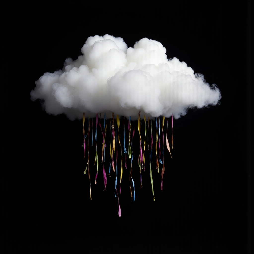 A whimsical cloud hangs against a dark backdrop, with vibrant ribbons cascading down, creating a playful and artistic atmosphere.