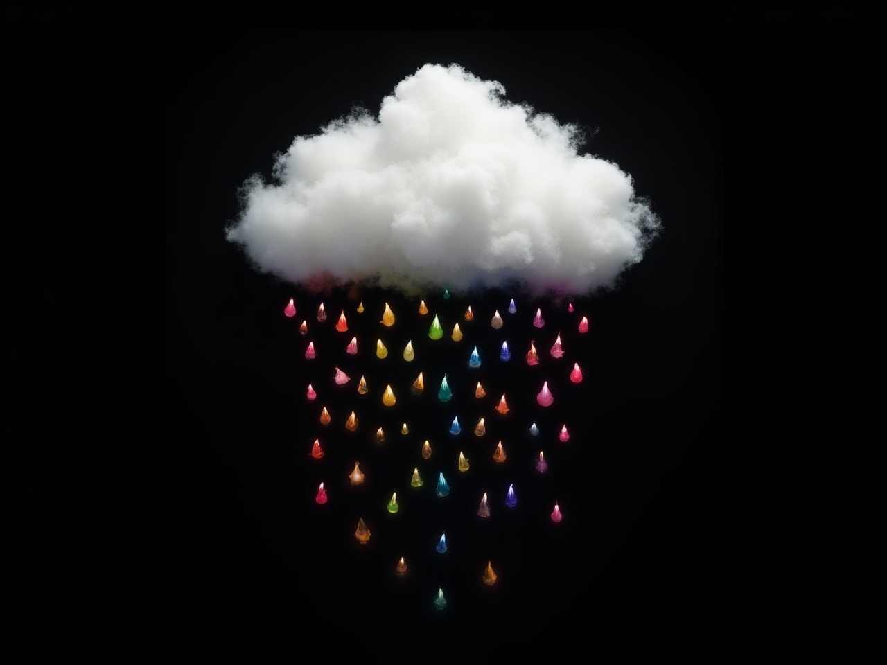 A fluffy white cloud drizzles vibrant raindrops in various colors against a dark backdrop, showcasing a whimsical and creative scene.