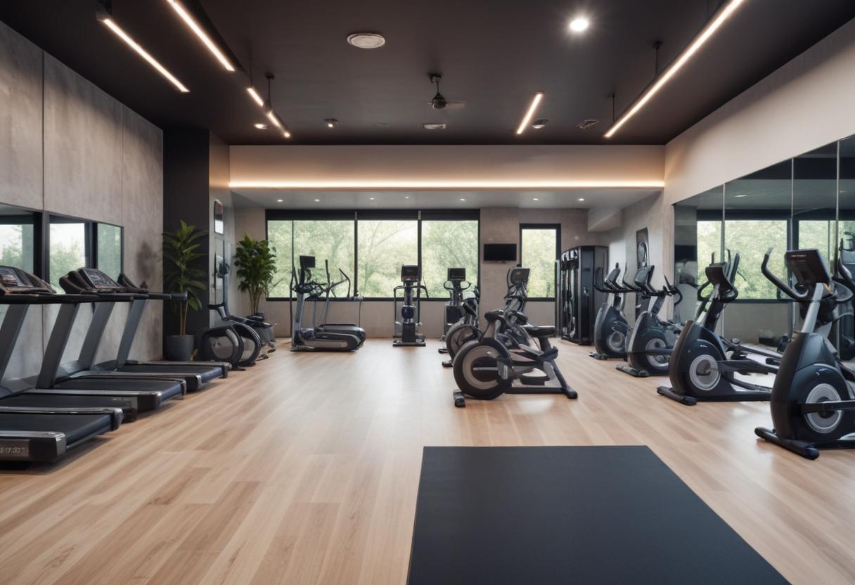 Modern gym with fitness gear and bright windows
