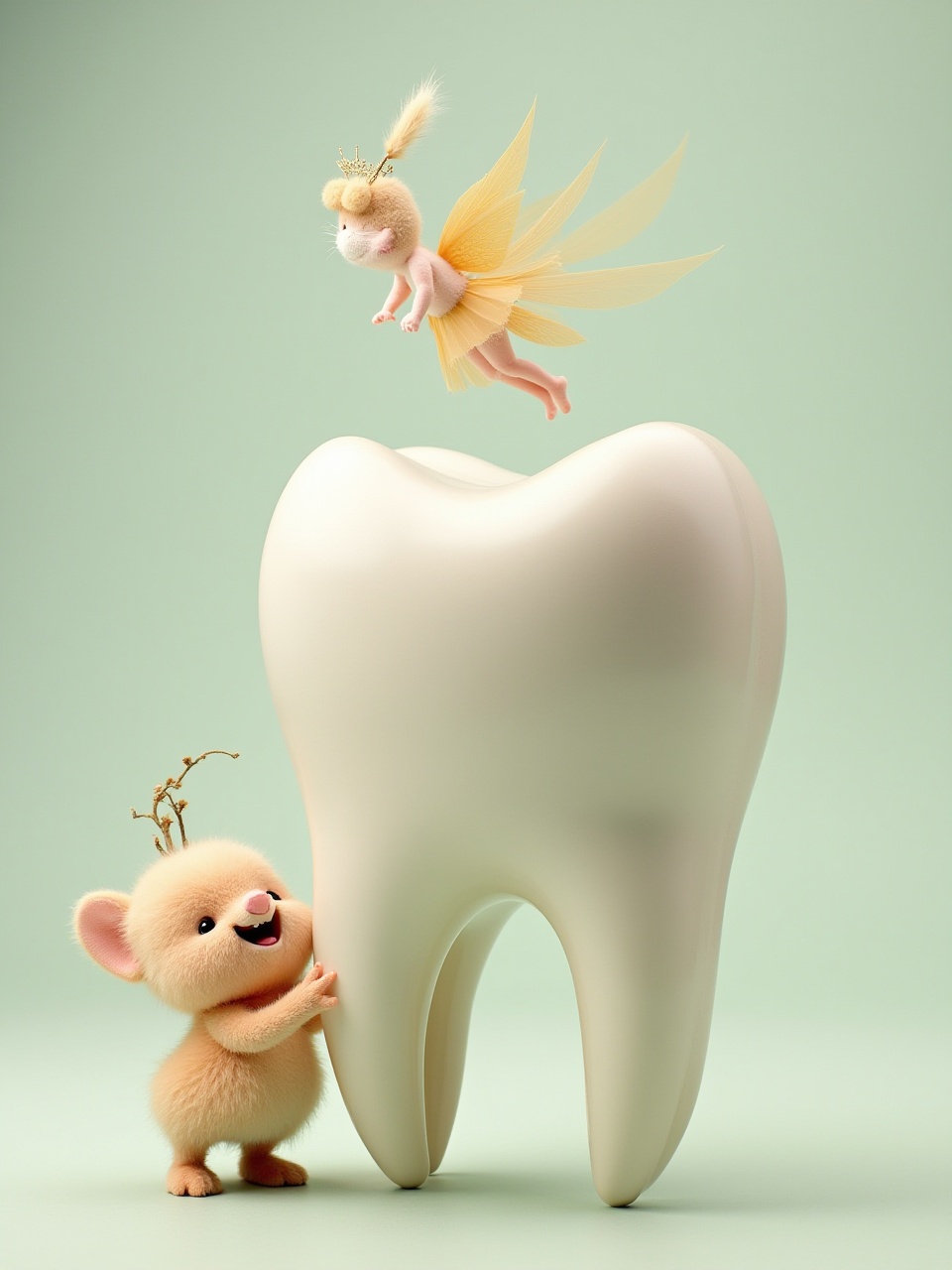 A small animal interacts with a large tooth while a fairy hovers above, creating a whimsical atmosphere in a light green environment.