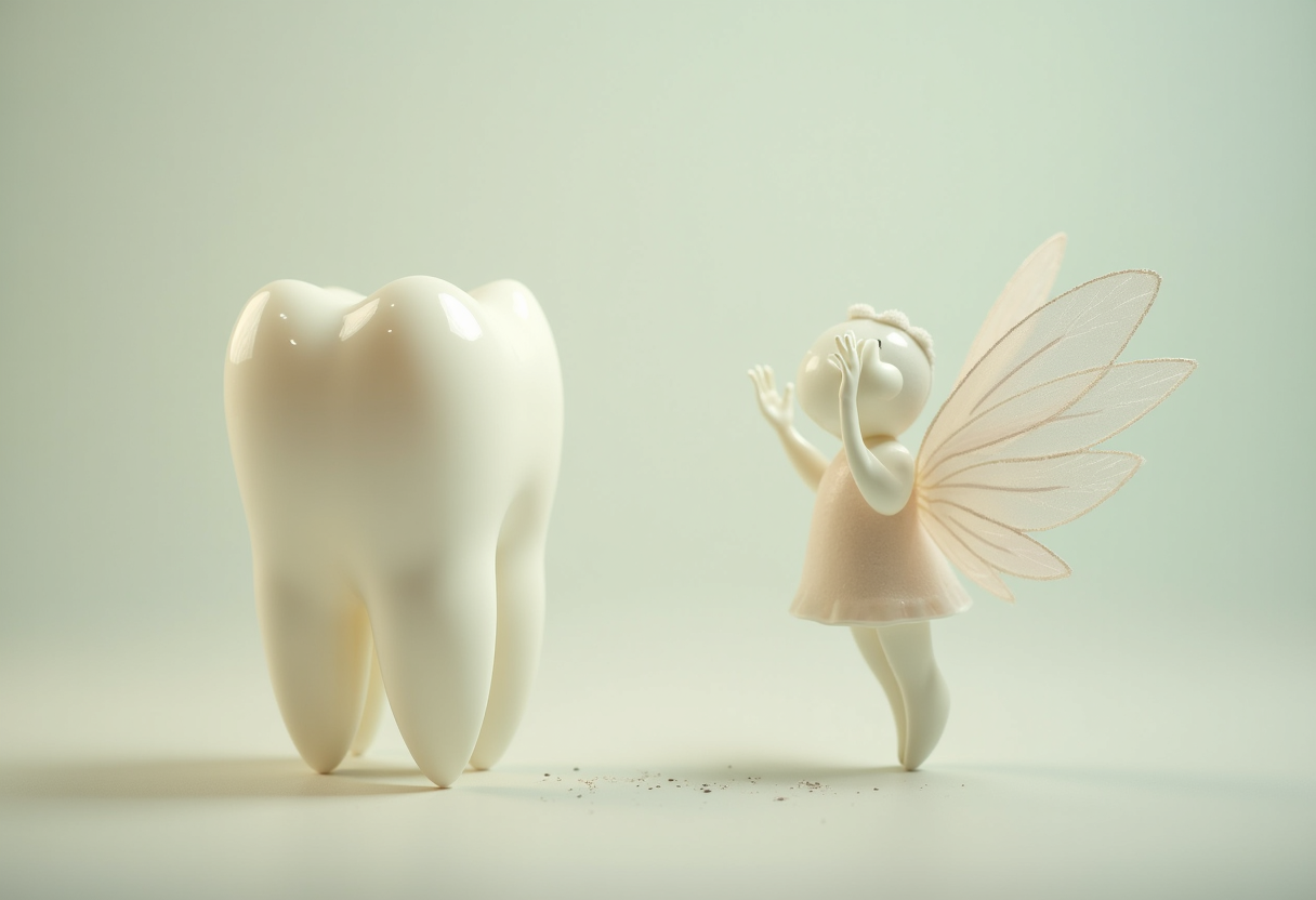 A charming tooth fairy stands beside an oversized tooth, creating a playful and enchanting atmosphere highlighting dental care.