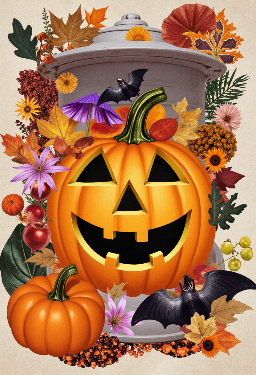 Colorful arrangement featuring a carved pumpkin, autumn leaves, and playful bats, celebrating the spirit of fall and Halloween festivities.