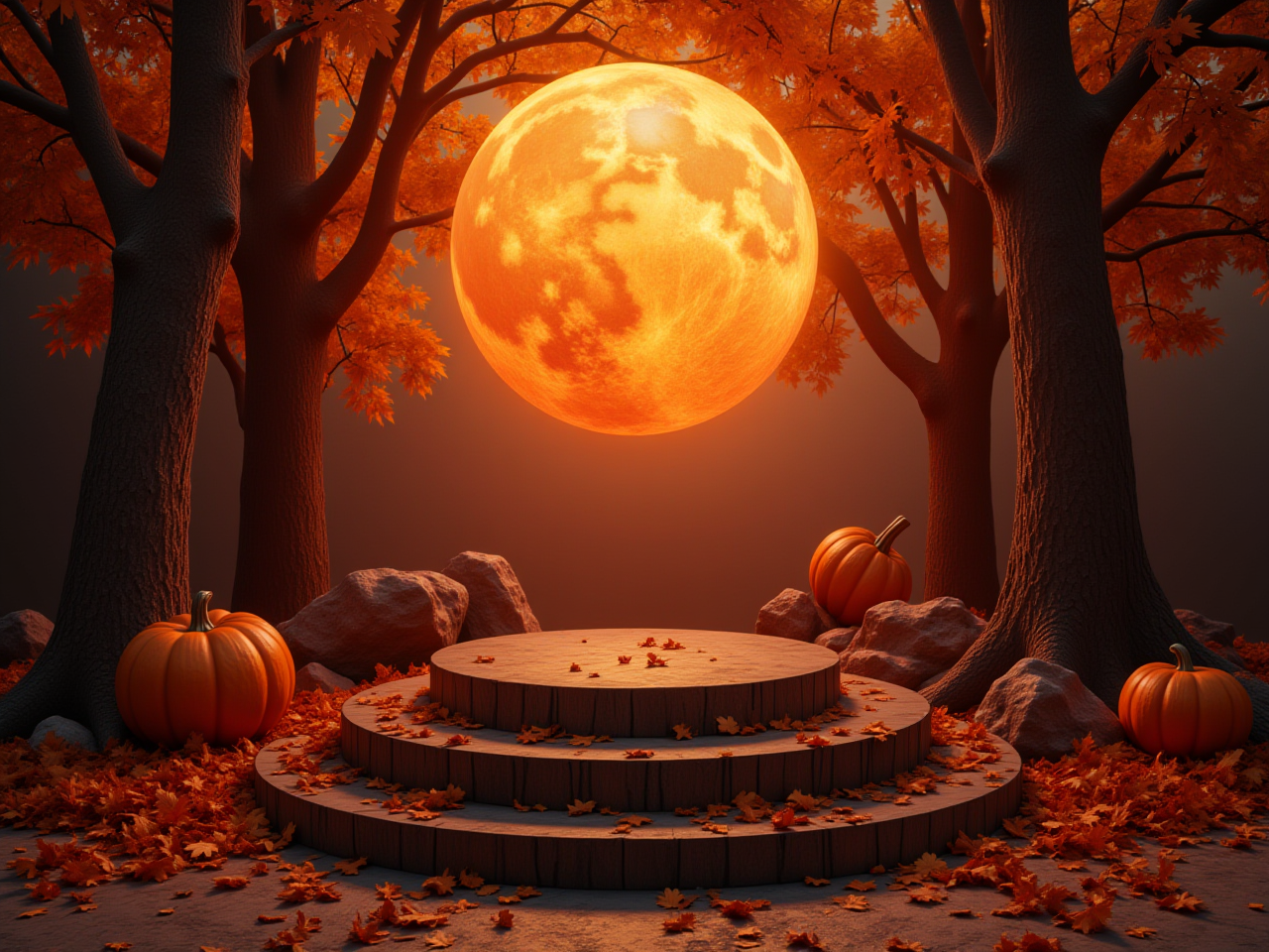 Bright orange full moon shines over autumn trees and pumpkins, creating a magical atmosphere in a serene outdoor setting.