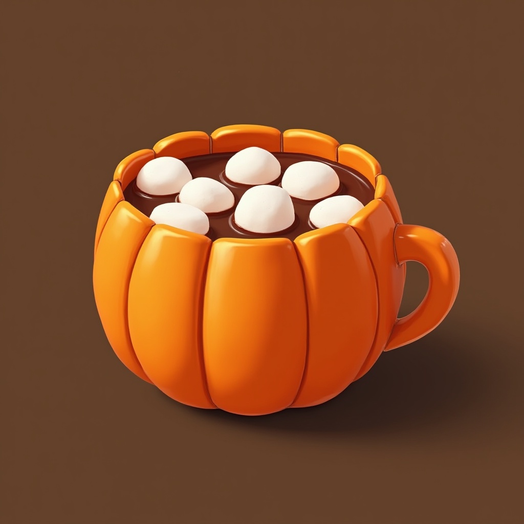 A cozy orange mug shaped like a pumpkin holds creamy hot cocoa topped with fluffy marshmallows, perfect for autumn evenings.