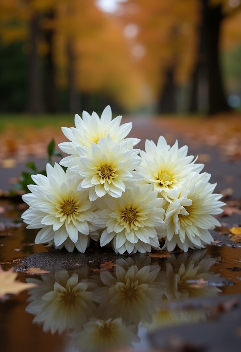 A cluster of white flowers rests on a path covered with autumn leaves. The flowers reflect in puddles, showcasing the tranquil beauty of fall.