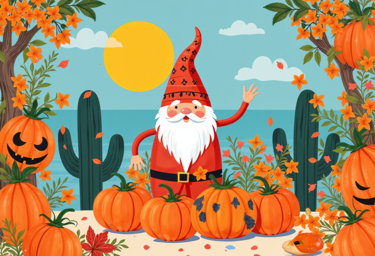 A cheerful gnome waves amidst pumpkins and flowers by the ocean. Bright sunshine and cacti surround this playful autumn scene.