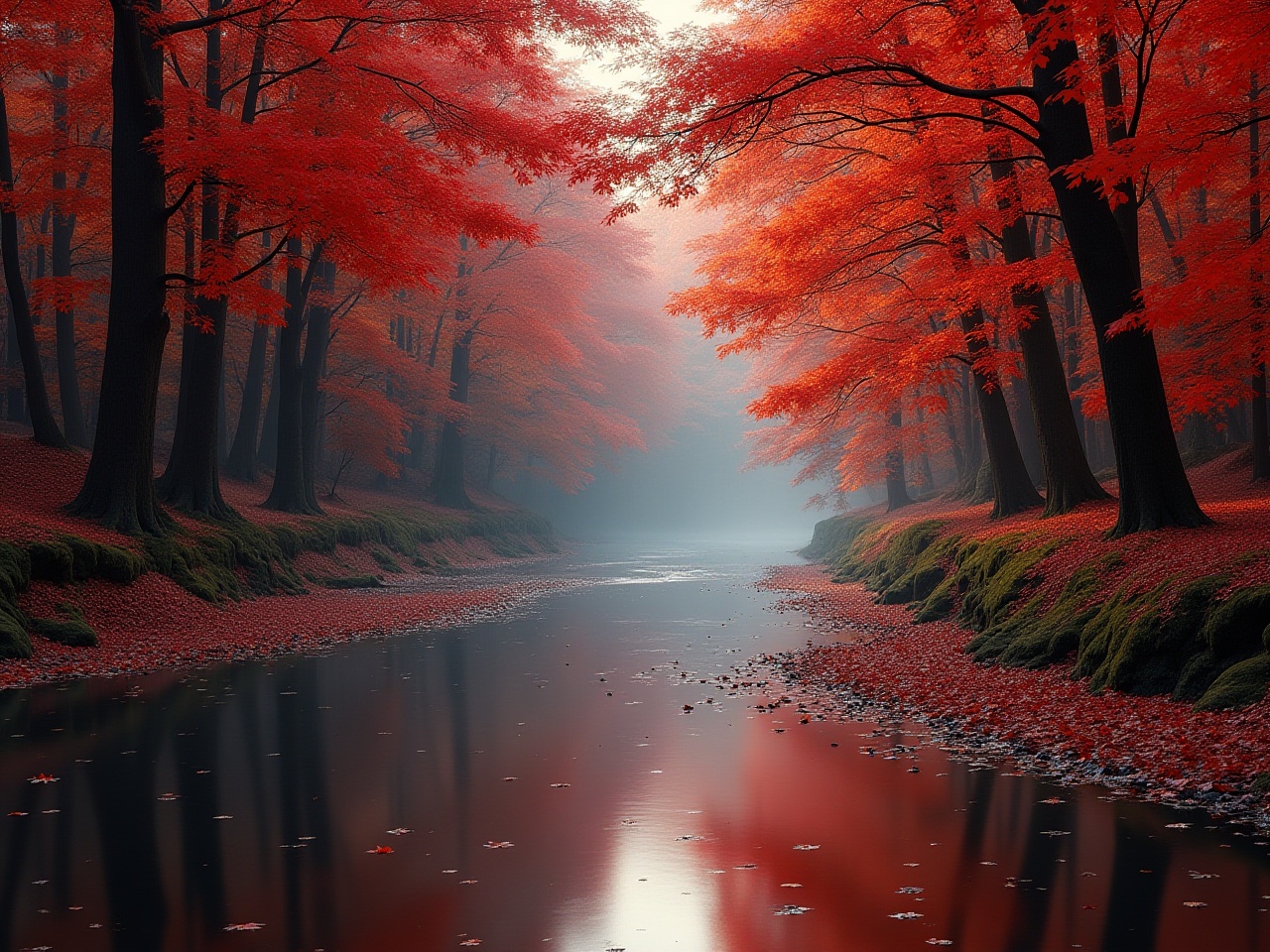 Bright red leaves cover trees along a serene river, creating a stunning view during early morning with soft mist hovering over the water.