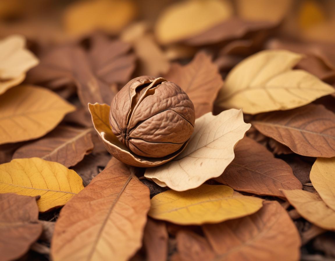 A walnut sits on a bed of colorful autumn leaves, showcasing nature's beauty during fall in a peaceful outdoor environment.