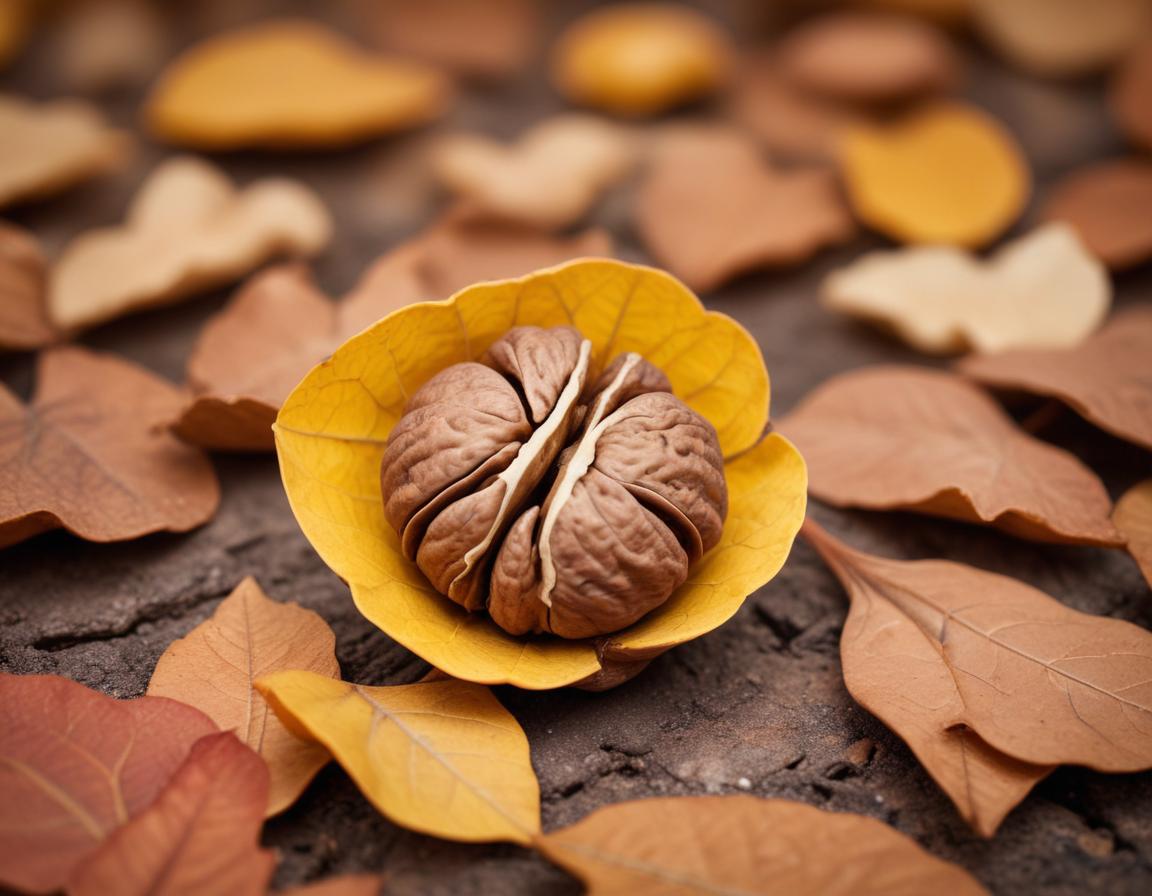 Unique walnut resting on autumn leaves in nature