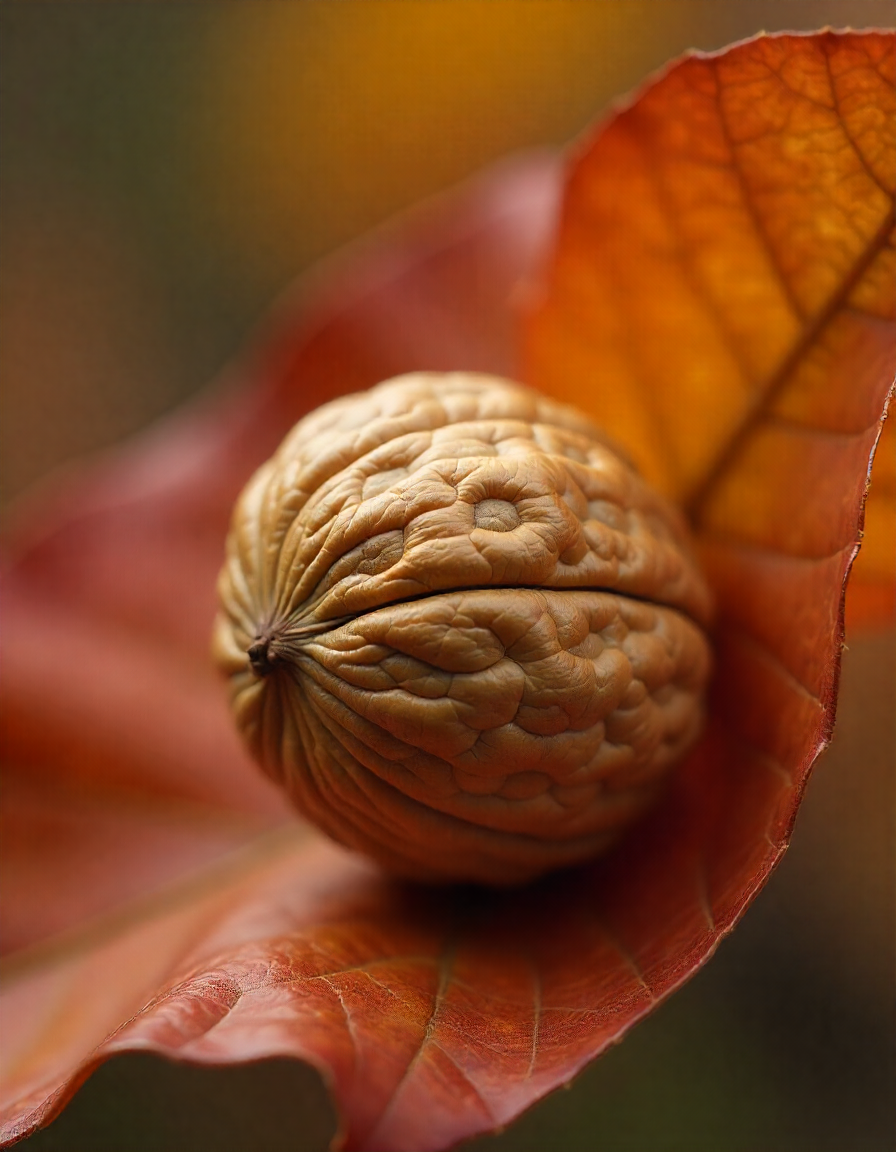 A walnut lies on a colorful autumn leaf, highlighting the rich textures and warm tones of the season's change.