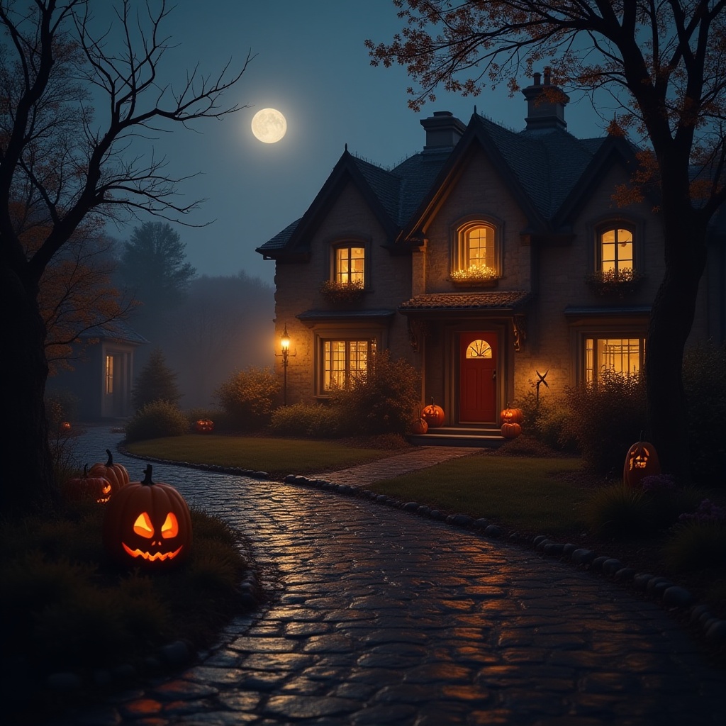 A cozy house glows warmly at night, surrounded by carved pumpkins and trees under a bright full moon, creating a festive Halloween atmosphere.