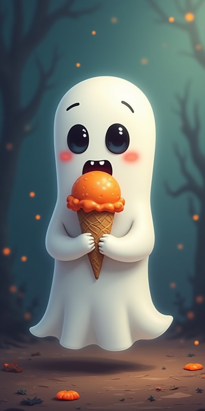 ambiance, autumn, cartoon, character, cheerful, cone, cute, dessert, forest, ghost, happy, ice cream, leaves, light, mist, orange, playful, smiling, spooky, treats