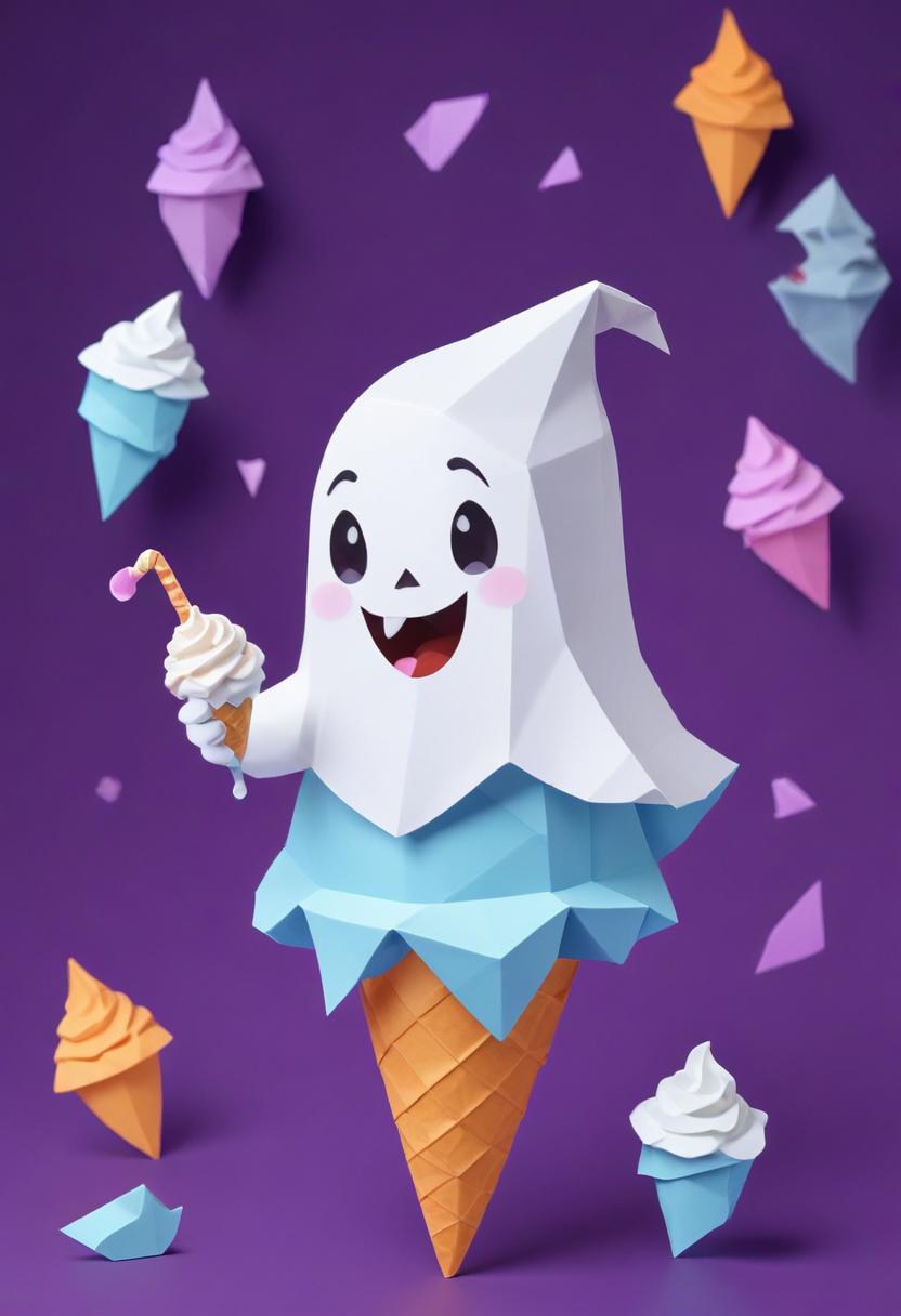 A cheerful ghost character made of paper enjoys ice cream while surrounded by colorful cone and soft serve decorations in a whimsical scene.