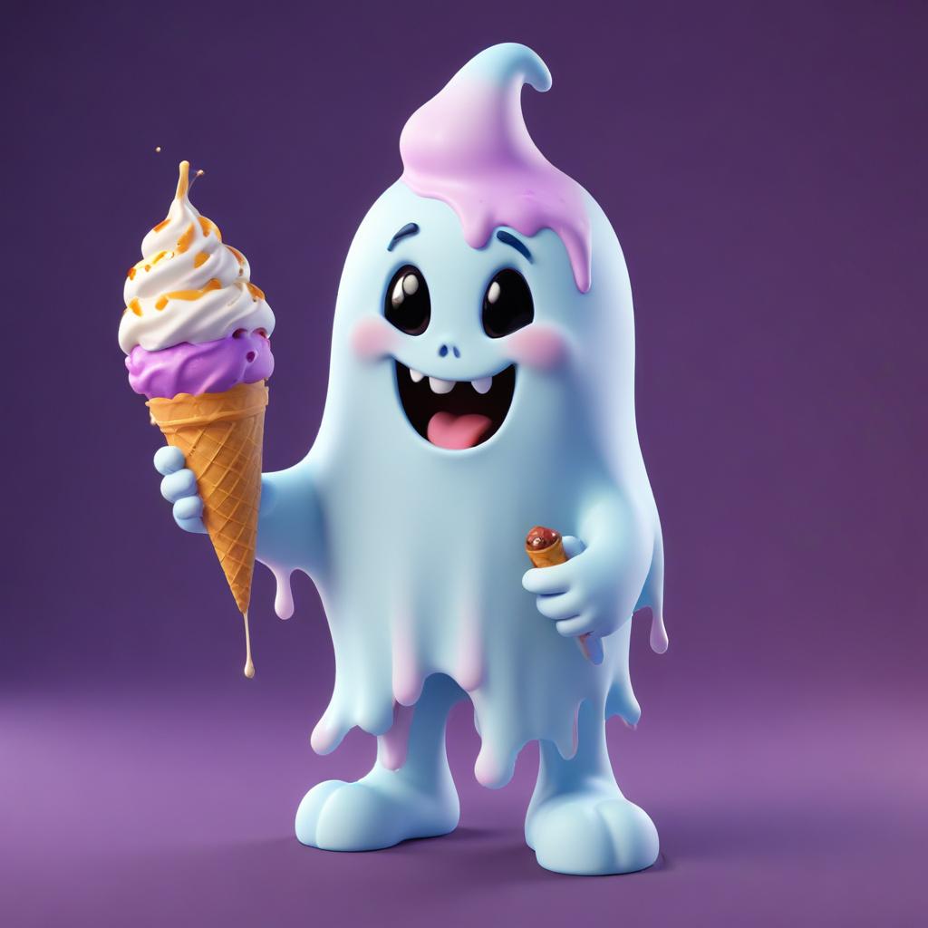 A playful ghost character enjoys an ice cream cone with swirls of purple and white. The cheerful design stands out against a purple background.