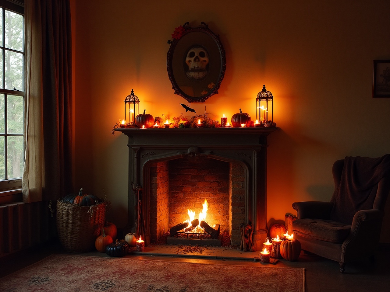 Halloween, ambiance, autumn, candles, charm, comfort, cozy, decorations, dim atmosphere, eerie, fireplace, home decor, living room, night, old furniture, pumpkins, relaxing, seasonal, spooky, warm light