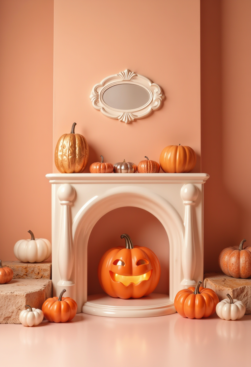 A cozy indoor scene with a white fireplace and pumpkins, including a carved jack-o'-lantern, evokes a cheerful autumn vibe.