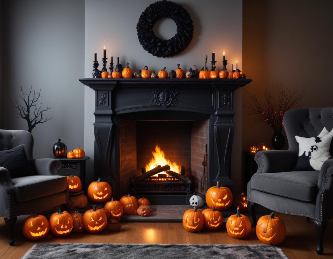A warm and inviting fireplace adorned with glowing jack-o'-lanterns and flickering candles creates a perfect Halloween atmosphere.
