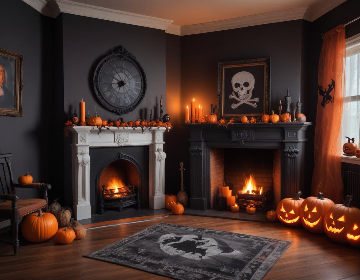 A warm living room features spooky Halloween decorations, including carved pumpkins, candles, and a cozy fireplace, all set in a dark theme.