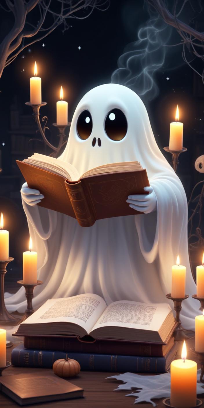A cute ghost character holds an open book, surrounded by flickering candles in a cozy, mystical setting, creating a warm atmosphere.