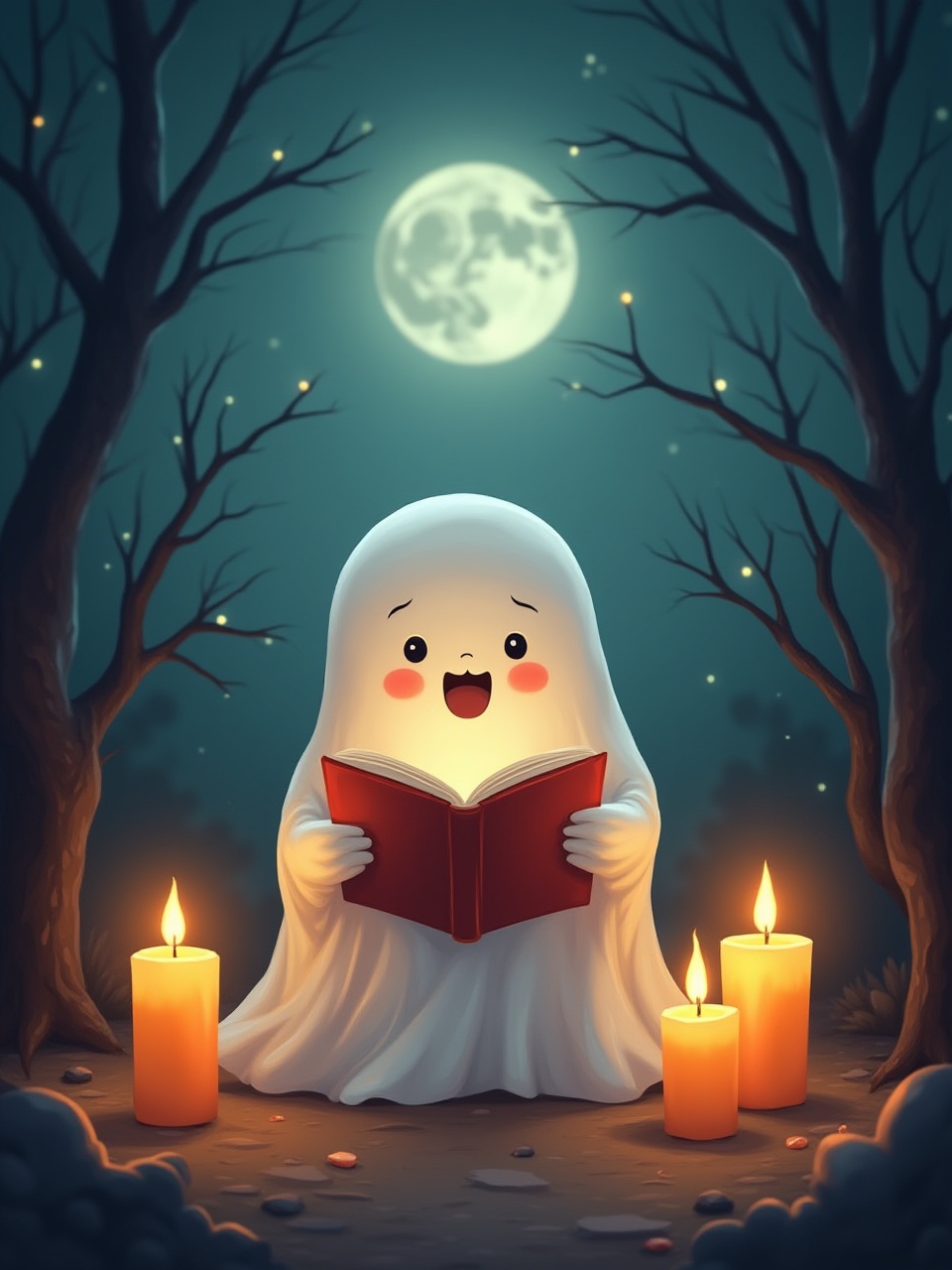 A cute ghost holds a book while sitting among candles at night, surrounded by dark trees and a bright full moon in the background.