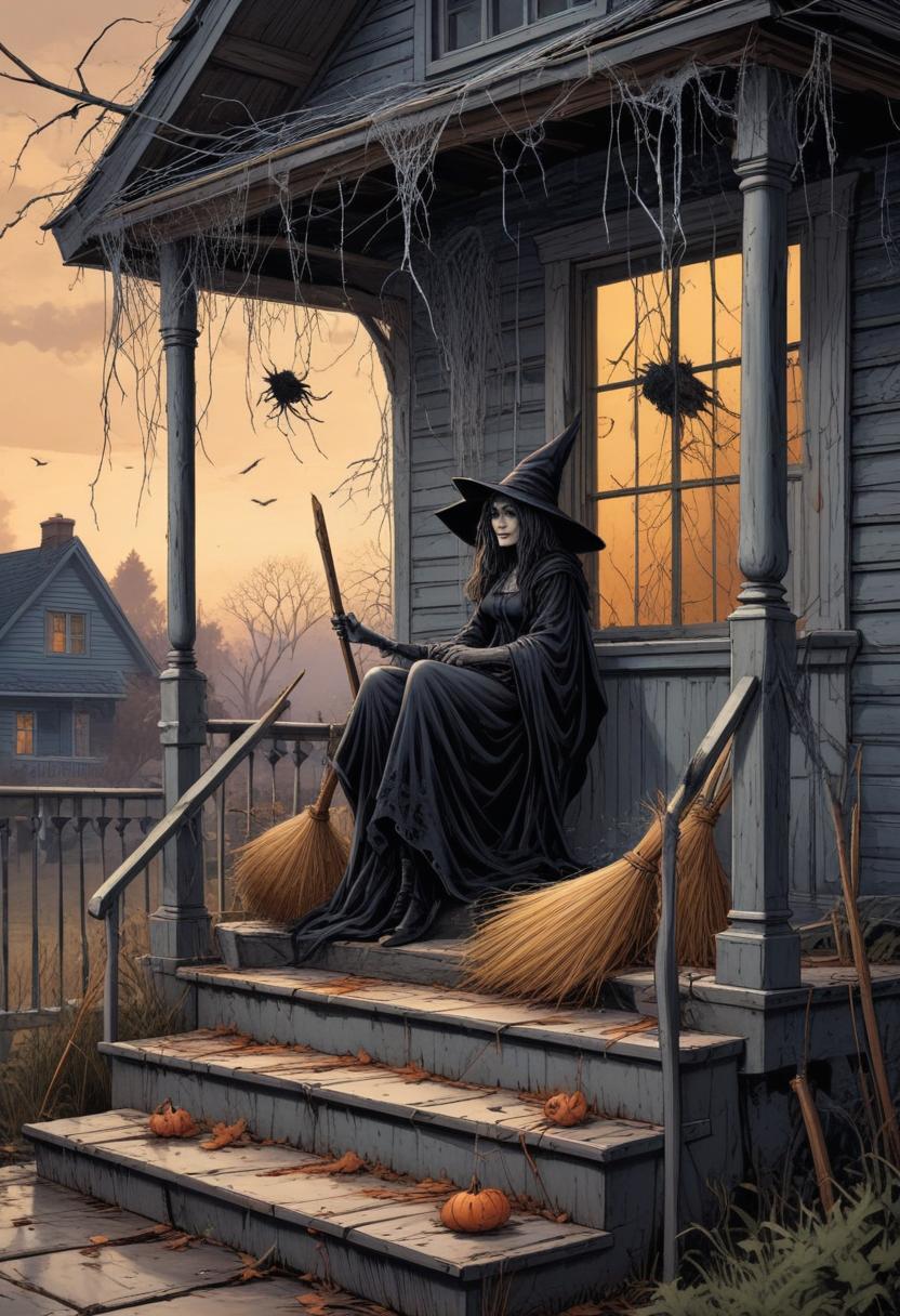 A witch in a black cloak sits on a wooden porch. Brooms rest beside her, set against a backdrop of an autumn sunset and spooky decorations.