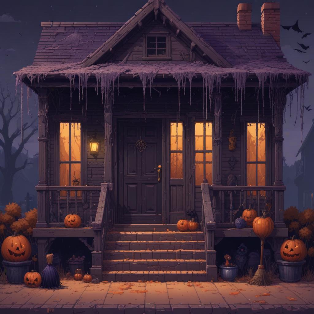 autumn, bats, celebration, creepy, decorations, eerie, festivities, ghosts, glowing windows, halloween, harvest, house, night, orange, porch, pumpkins, seasonal, shadows, spooky, twilight