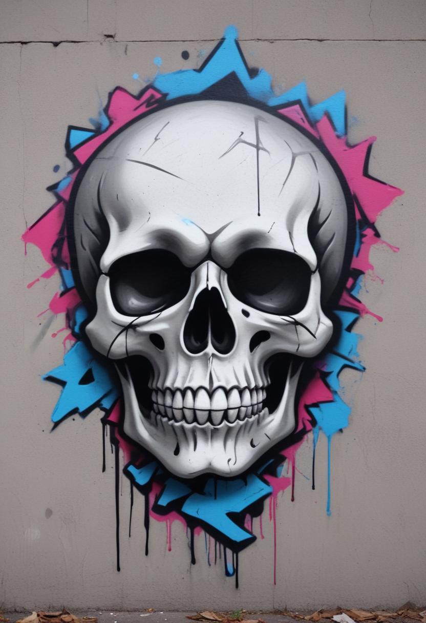Brightly colored skull mural adorns a concrete wall in an urban setting, showcasing artistic street art with splashes of color and intricate details.