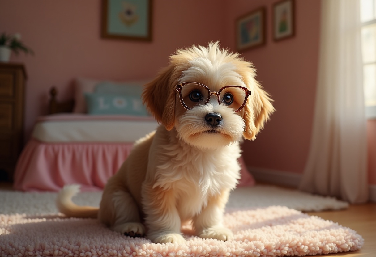 A fluffy puppy sits on a soft rug in a warm room, wearing stylish glasses. The bright space features soft colors and cozy decor.