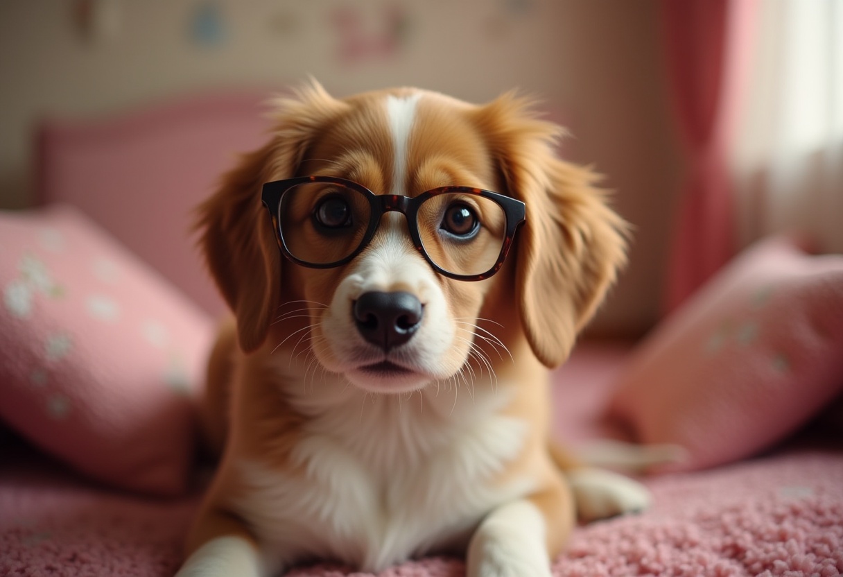adorable, animal, bed, bright, companion, cozy, cute, dog, expression, furry, glasses, home, indoors, pet, pink, playful, puppy, relaxed, room, sitting