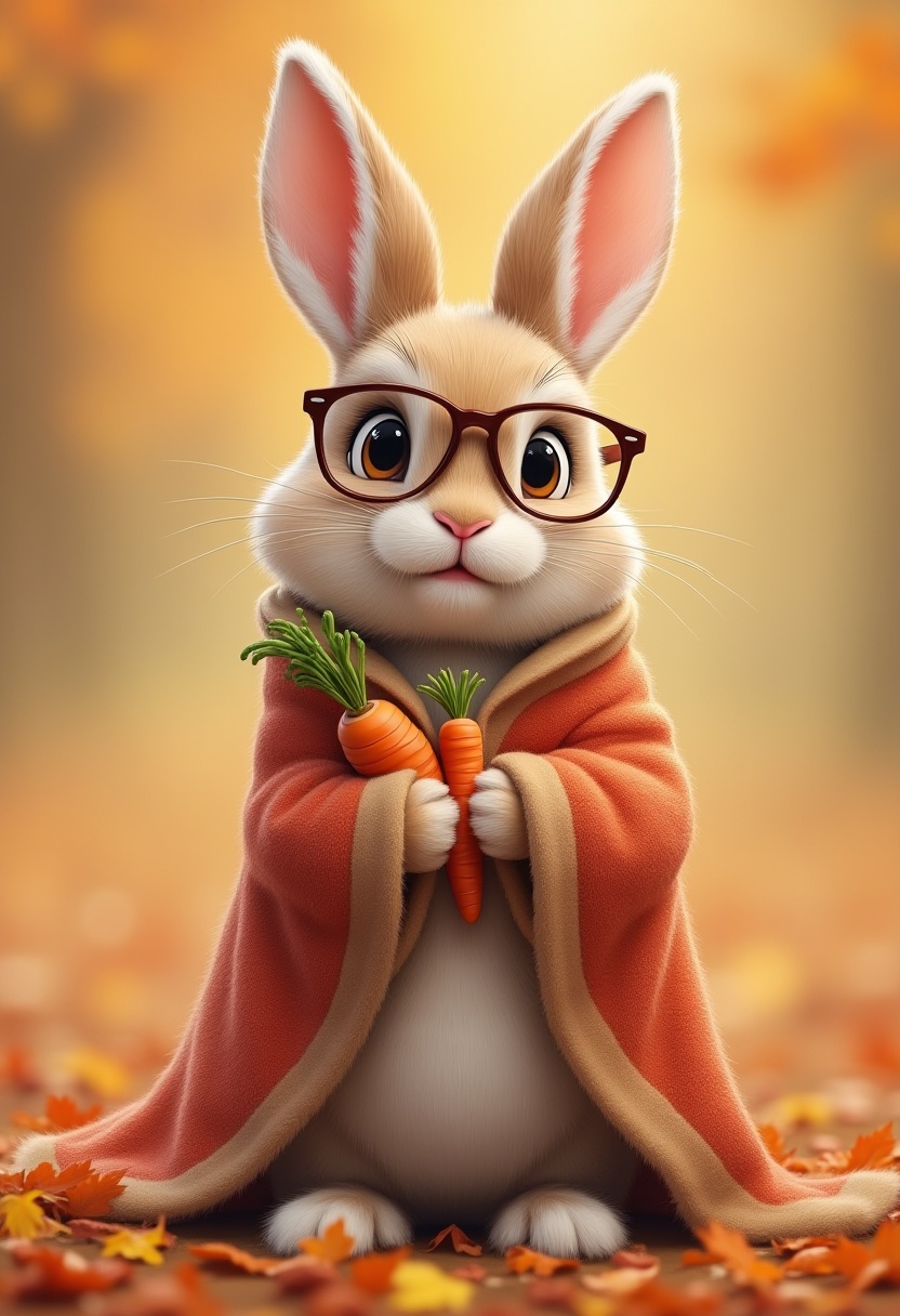 A rabbit in glasses dressed in a warm cloak holds two carrots among colorful autumn leaves, capturing the cozy vibe of fall.
