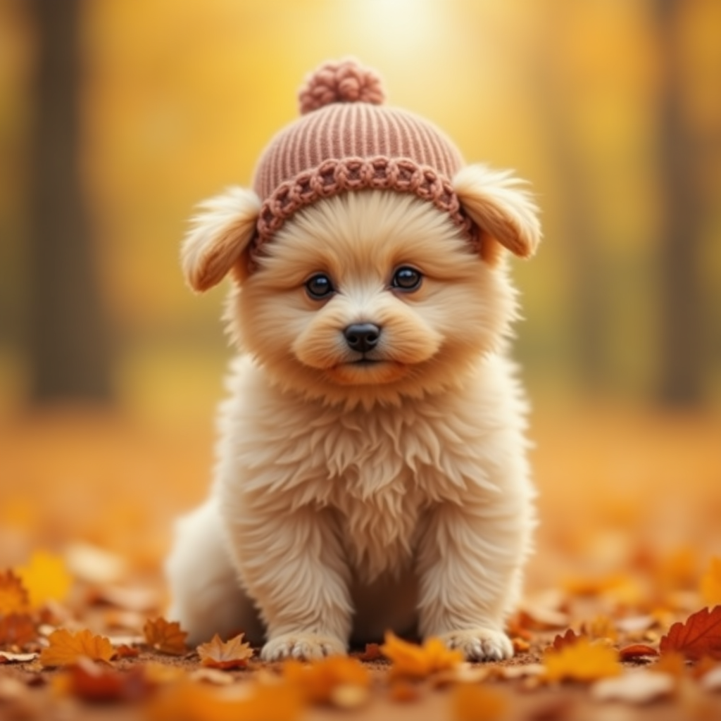 A fluffy puppy sits on colorful autumn leaves, wearing a knitted hat. The warm sunlight filters through the trees, creating a cozy atmosphere.