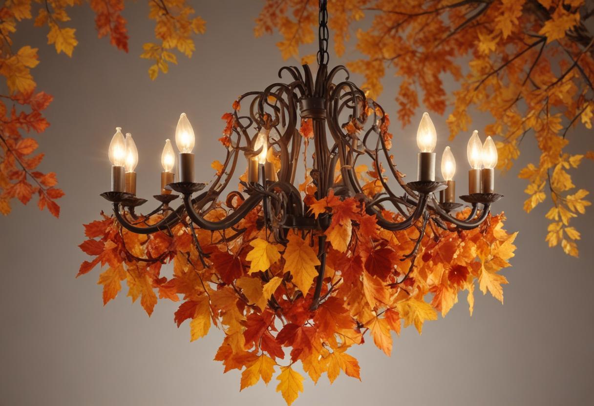 A decorative chandelier hangs from the ceiling, surrounded by vibrant autumn leaves. The warm light creates a cozy atmosphere.