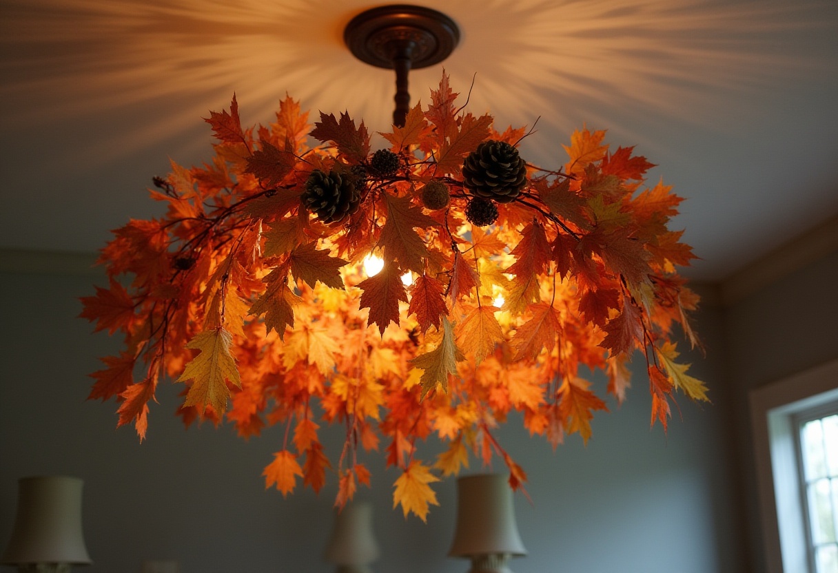 A beautiful chandelier decorated with orange leaves and pinecones illuminates a cozy room, creating an autumn atmosphere and warm ambiance.