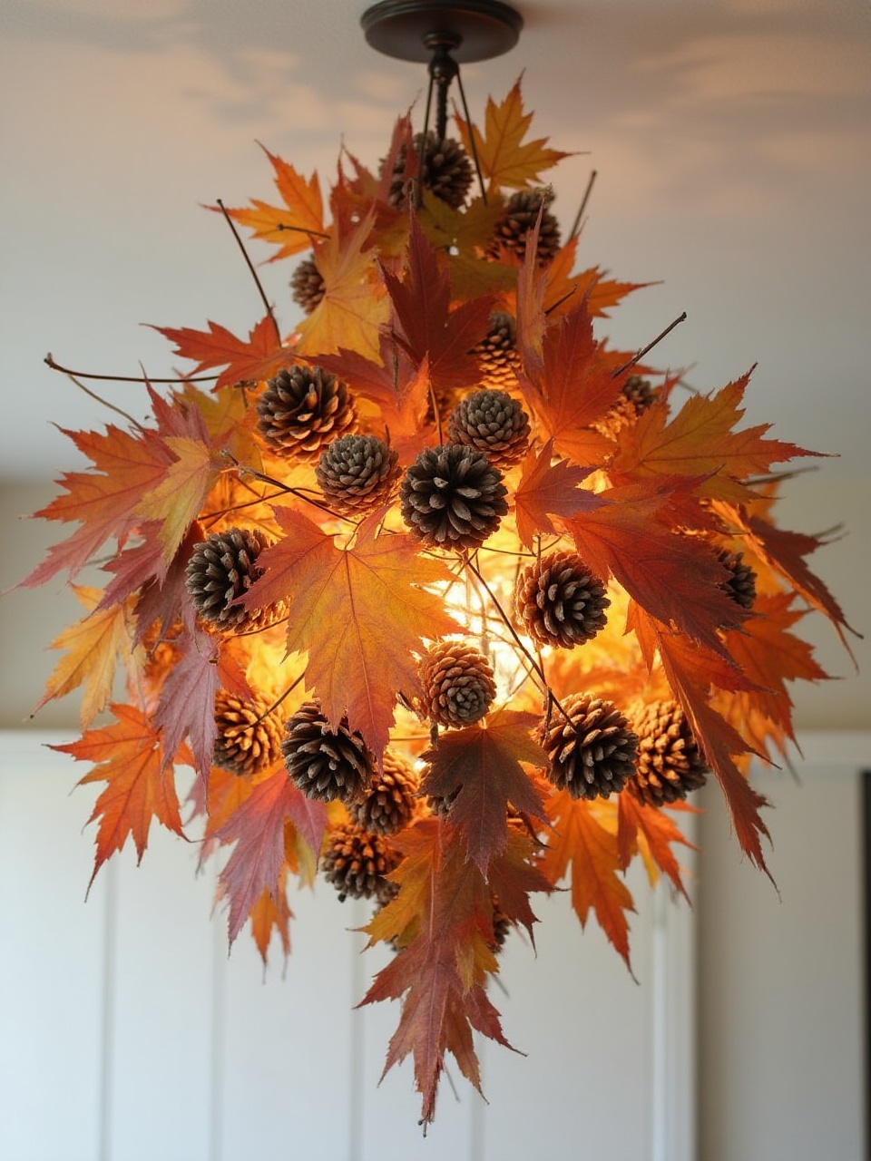 ambiance, autumn, branches, chandelier, colors, cozy, craft, decorative, fall, hanging light, home decor, illuminated, interior design, leaves, lighting, nature, pinecones, seasonal, unique, warm