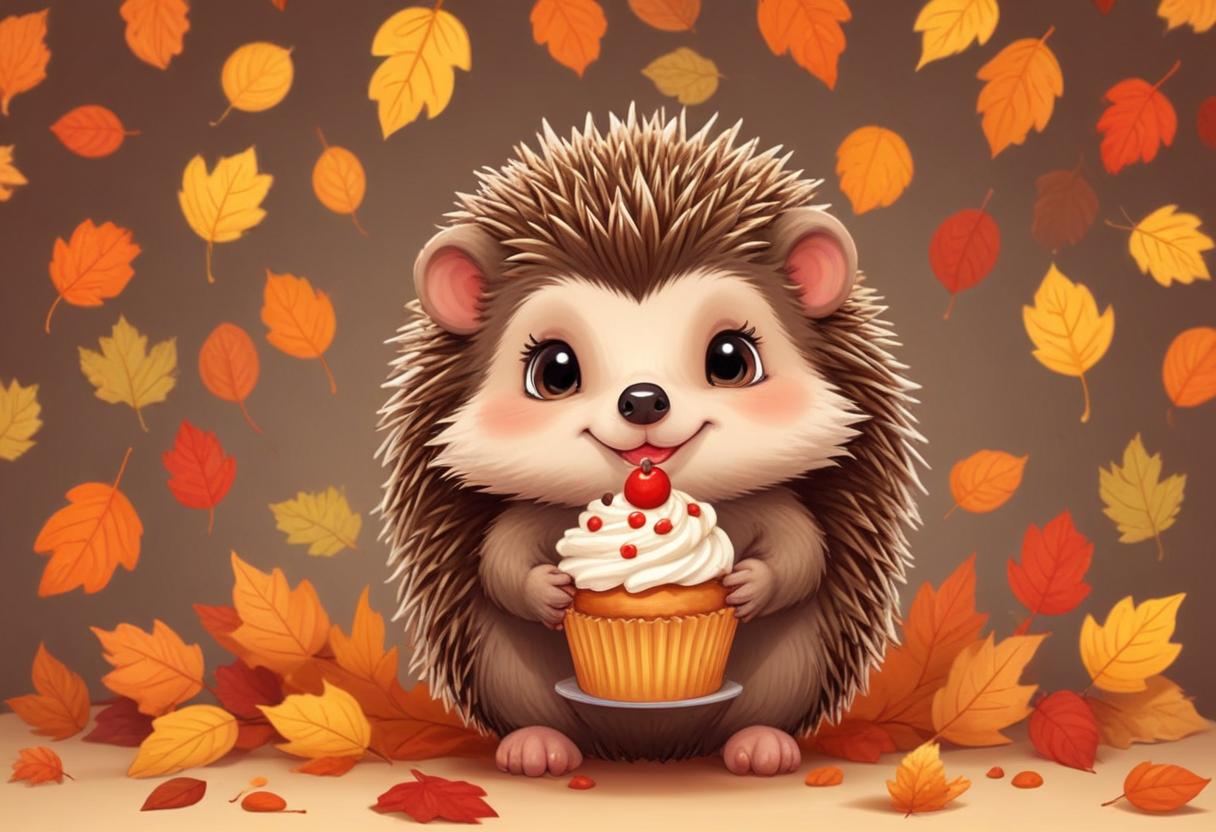 A happy hedgehog smiles while holding a cupcake with frosting and a cherry, surrounded by colorful autumn leaves.