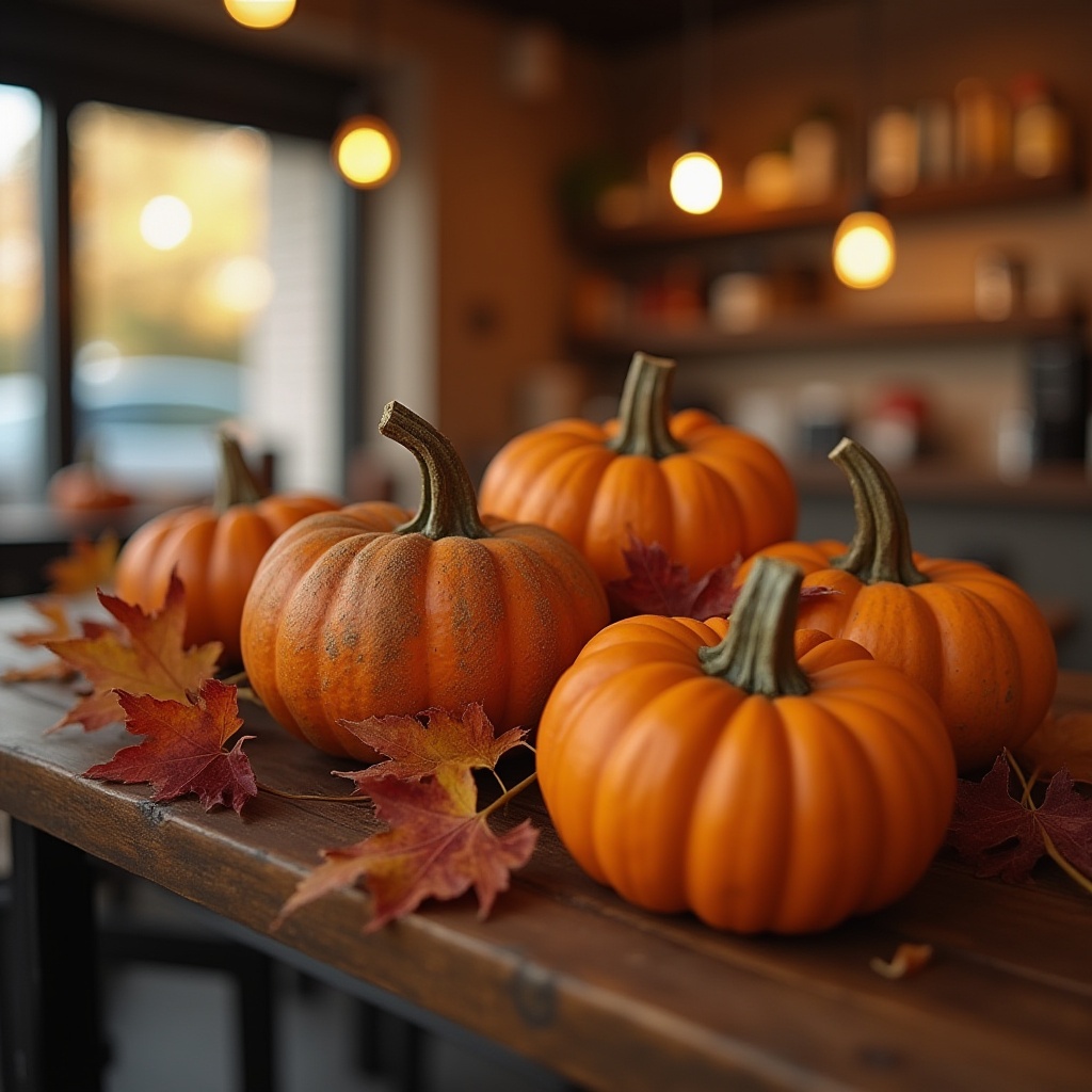 Small pumpkins sit on a wooden table surrounded by colorful autumn leaves. The cozy cafe ambiance enhances the fall season feel.