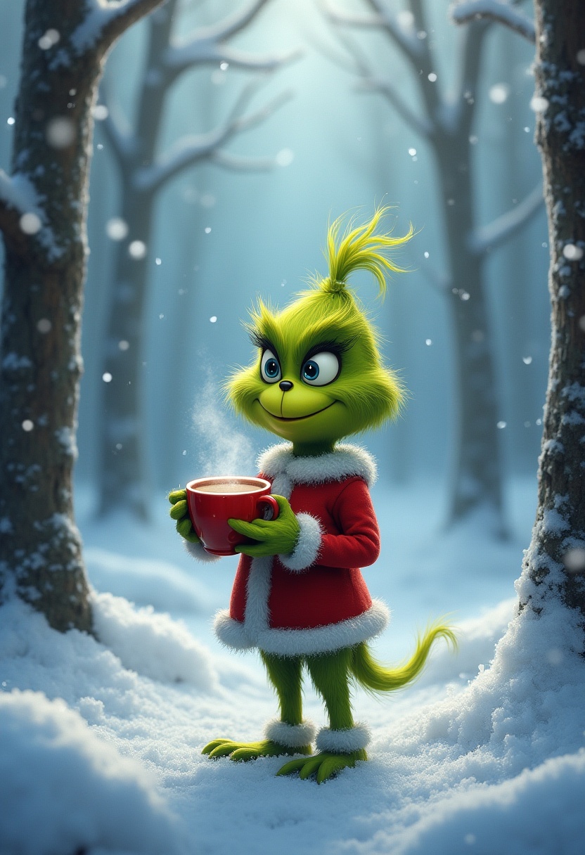 A green creature in a red outfit stands in a snowy forest, holding a steaming cup. Snowflakes fall around, creating a winter scene.
