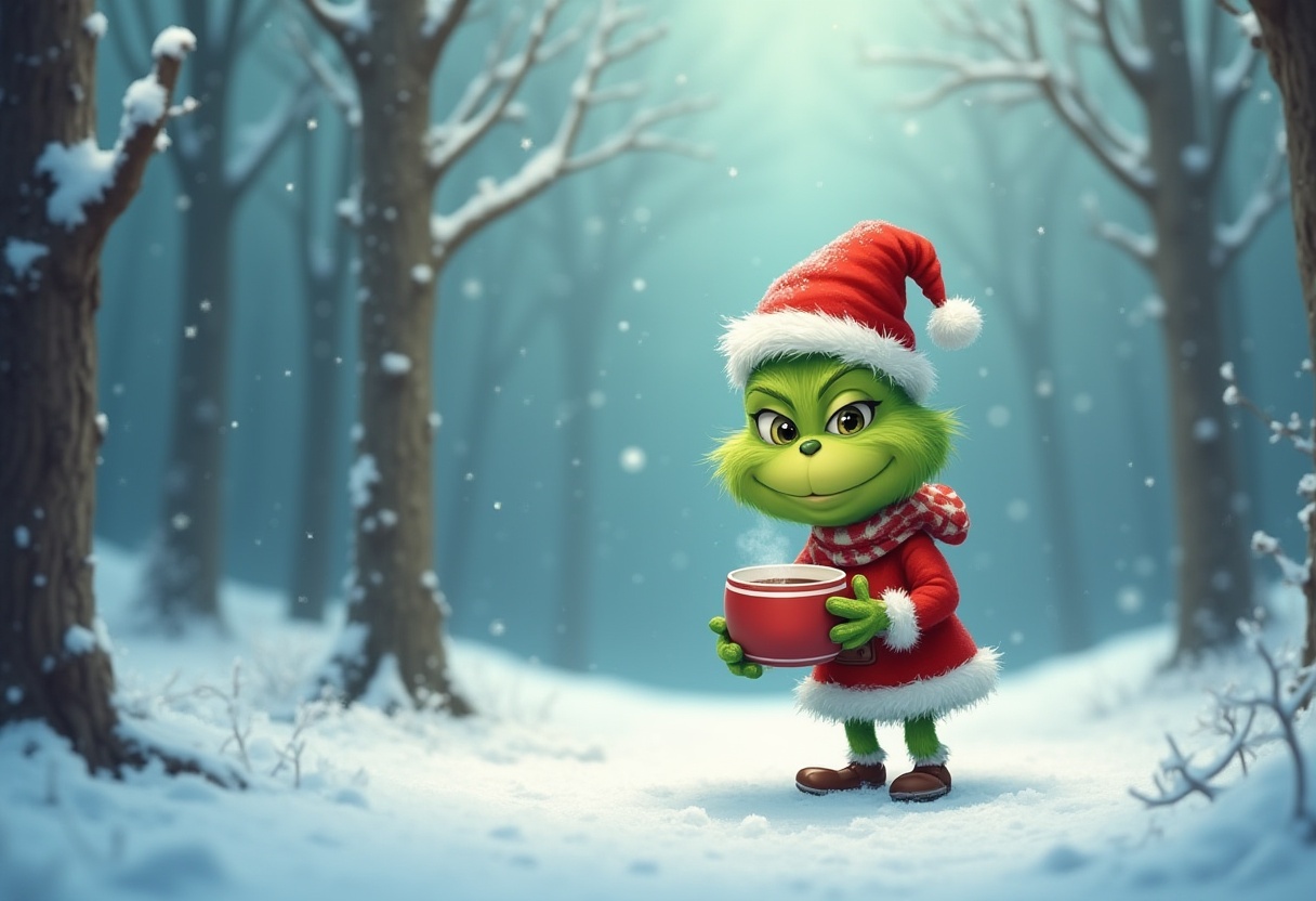 The Grinch stands in a snowy forest wearing a Santa hat. He holds a festive mug while surrounded by tall trees.