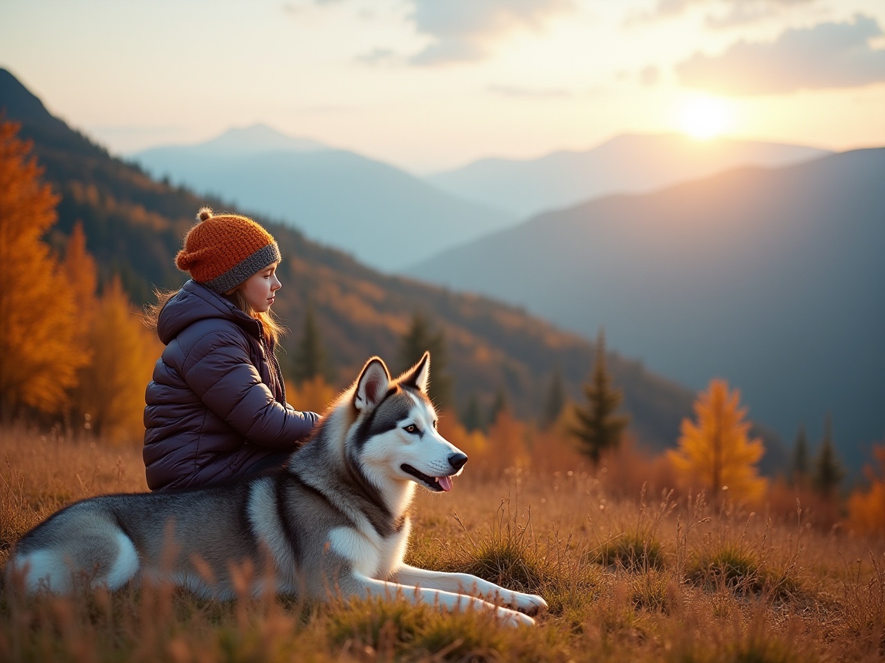 A child wearing an orange hat sits on a hillside with a husky as the sun sets behind mountains, painting the sky in warm colors.