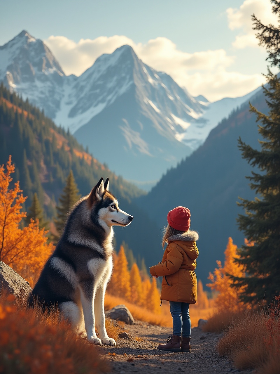 A child wearing a red hat stands next to a large dog, both looking at the majestic mountains surrounded by colorful autumn trees.