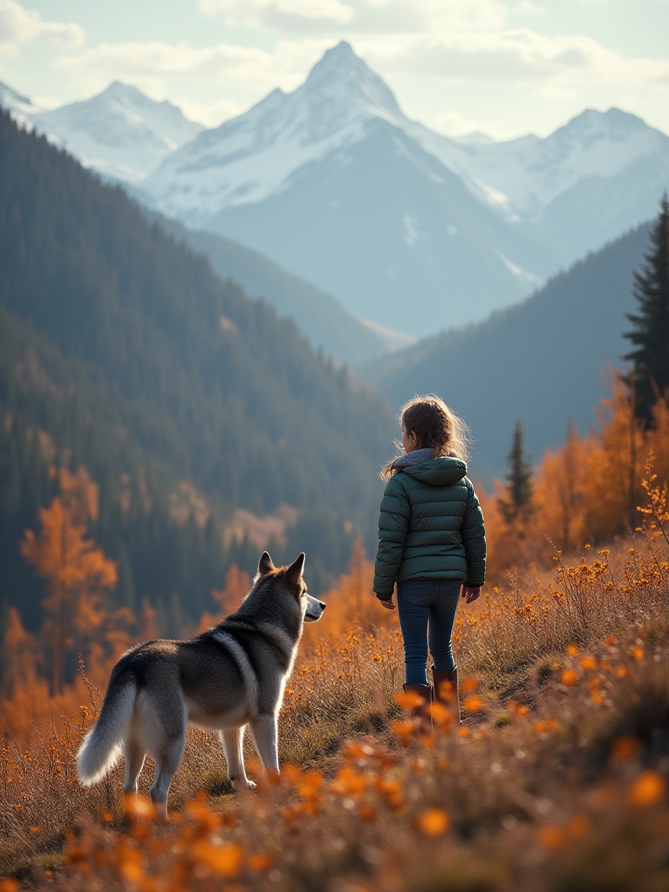 A girl stands beside a dog, gazing at the colorful mountains during autumn. The sun sets behind the peaks, highlighting the scenery.