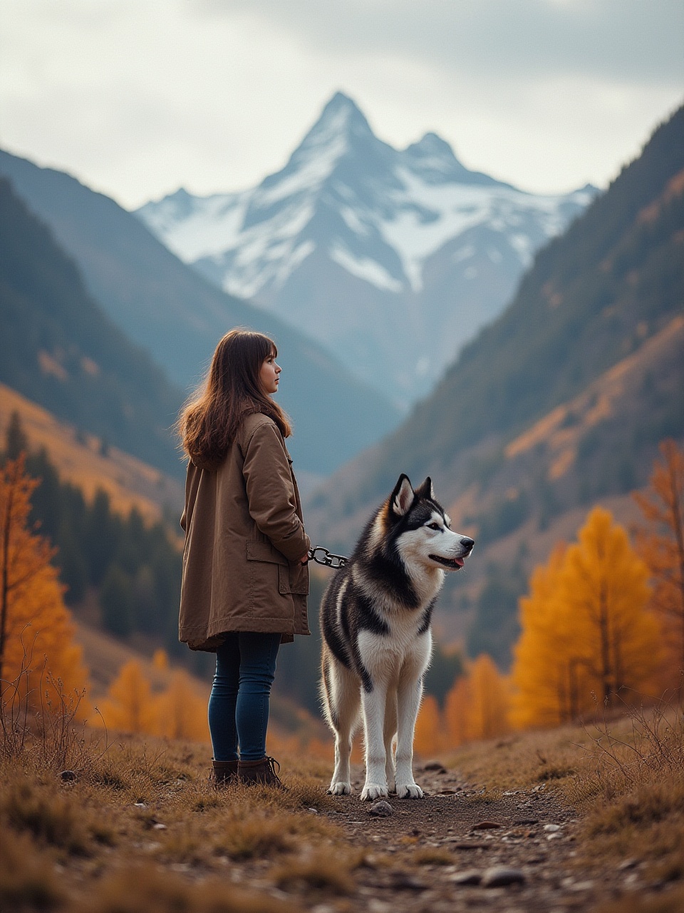 A girl stands next to her husky in a mountain valley filled with autumn colors and tall peaks, enjoying the cool weather and scenery.