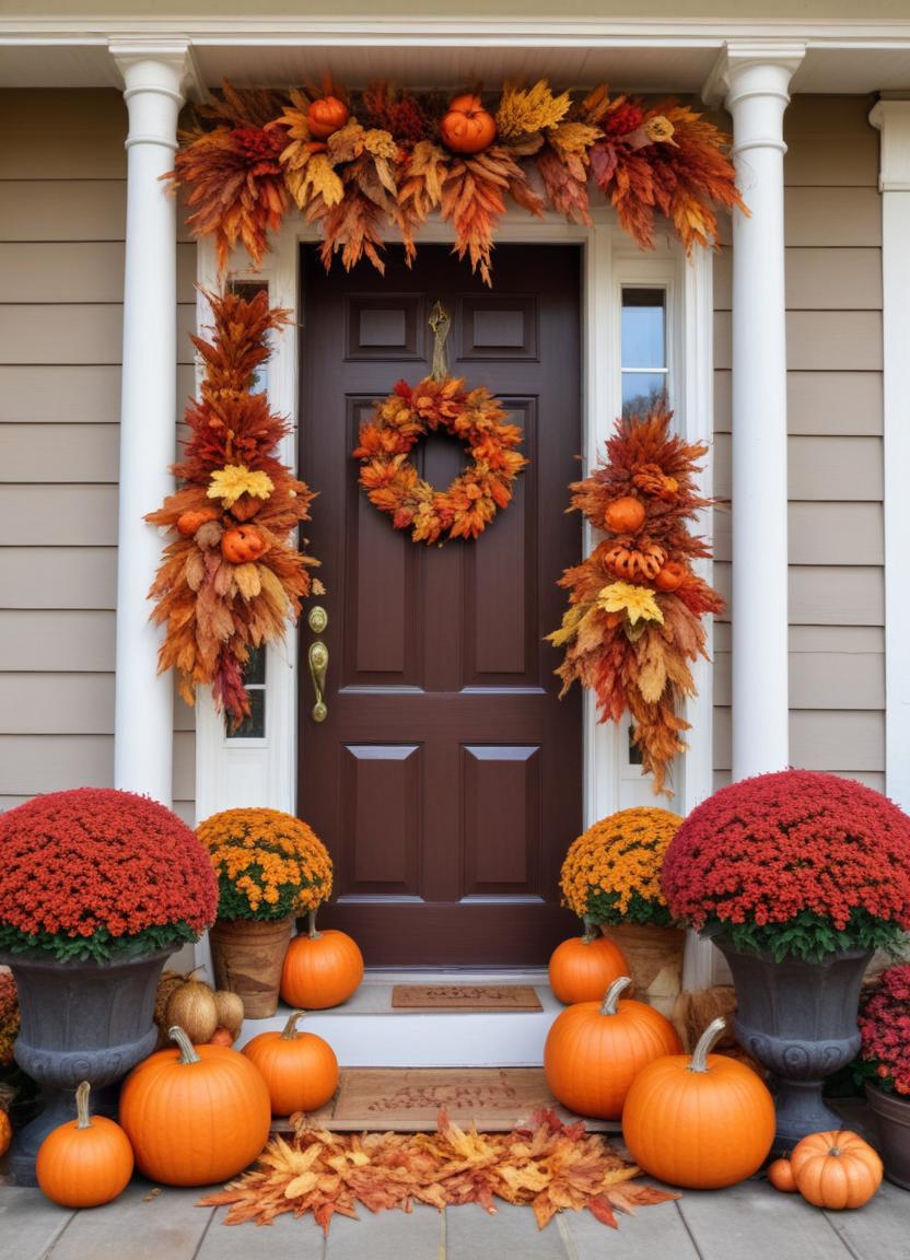 Thanksgiving, autumn, autumn colors, chrysanthemums, cozy atmosphere, fall decorations, festive, foliage, front door, harvest, home, home entrance, orange leaves, outdoor decor, porch, pumpkin arrangements, pumpkins, seasonal decor, warm welcome, wreath