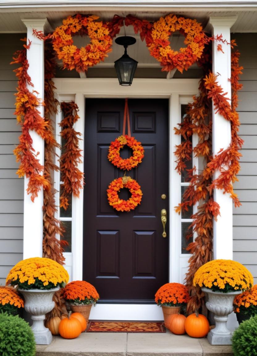 autumn entrance, colorful flowers, cozy home, door wreaths, fall decorations, fall flowers, festive leaves, front door, front porch, front yard, harvest season, holiday cheer, home entrance, inviting setting, outdoor decor, porch plants, pumpkin display, seasonal decor, warm colors, welcoming atmosphere