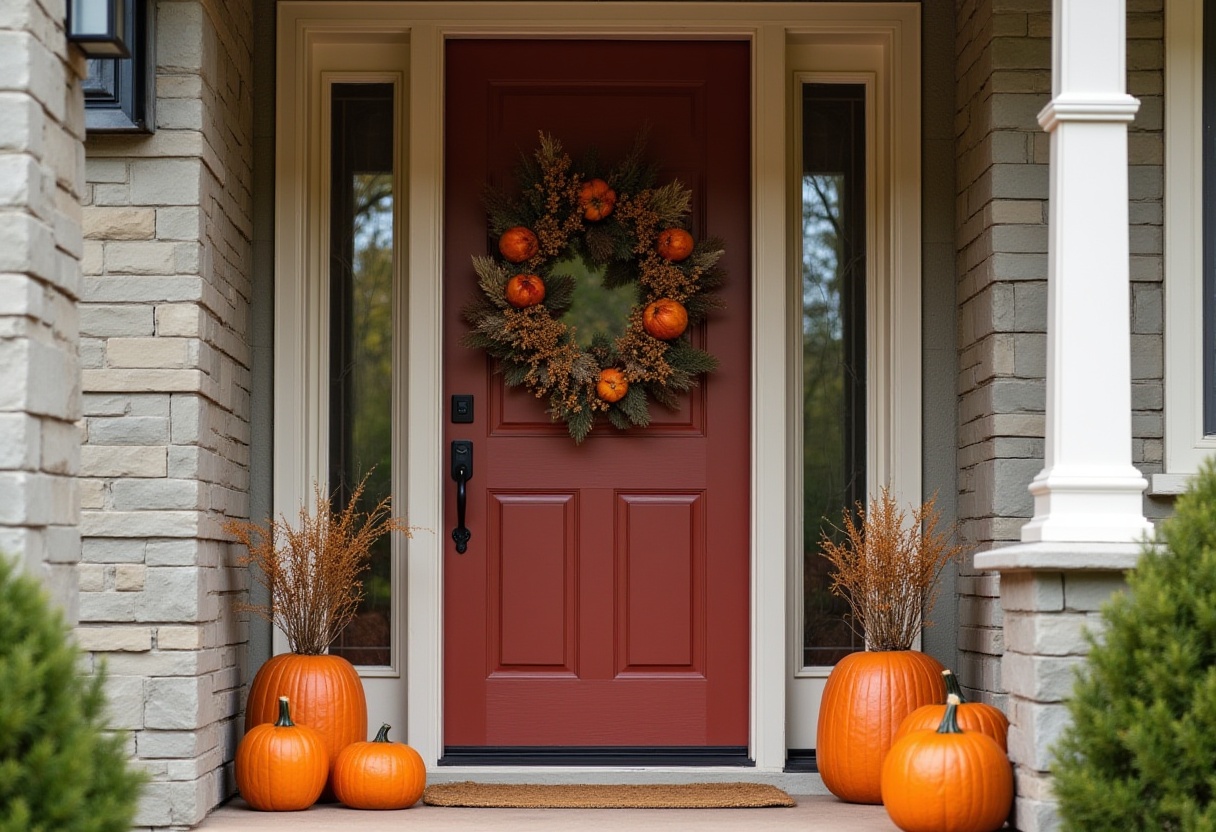 The front door features a red color with an autumn wreath adorned with pumpkins. Large pumpkins sit on either side, enhancing the seasonal decoration.